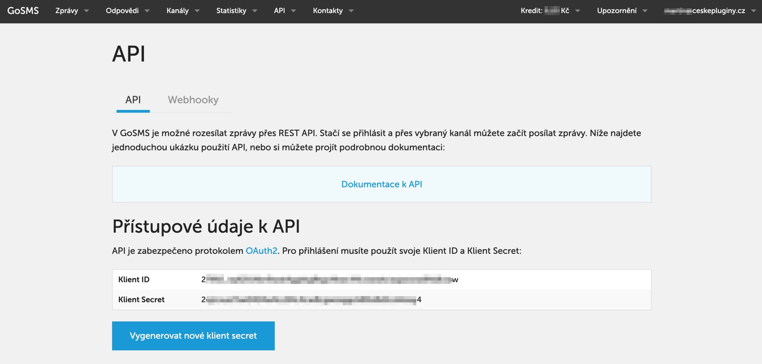Nejdříve bude potřeba získat přístupové údaje k API služby GoSMS. Jděte na stránku app.gosms.eu a přihlaste se. Pokud ještě nemáte účet, tak si ho zdarma registrujte. Po registraci nezapomeňte podporu požádat o připsání kreditu 20 Kč, který se vám bude hodit na testování pluginu.