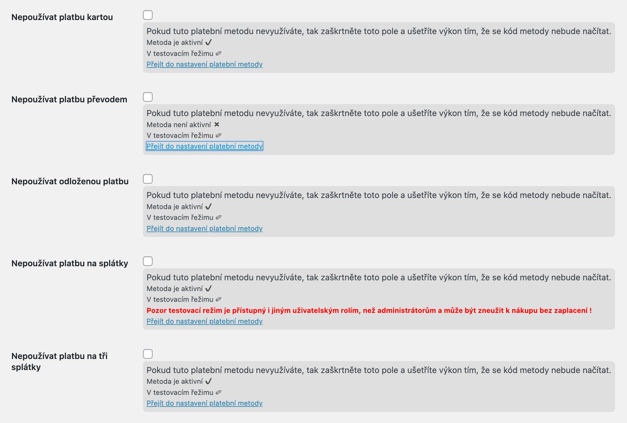 U každé platební metody uvidíte informaci zda je platební metoda aktivní v rámci nastavení WooCommerce, jestli je v testovacím módu a také zobrazí výstrahu v případě, že je platební metoda v testovacím módu, ale zároveň ji mohou používat i uživatelé s jinou rolí, než je role administrátora. Taky jsou tam linky, přes které se dostanete do nastavení jednotlivých platebních metod.