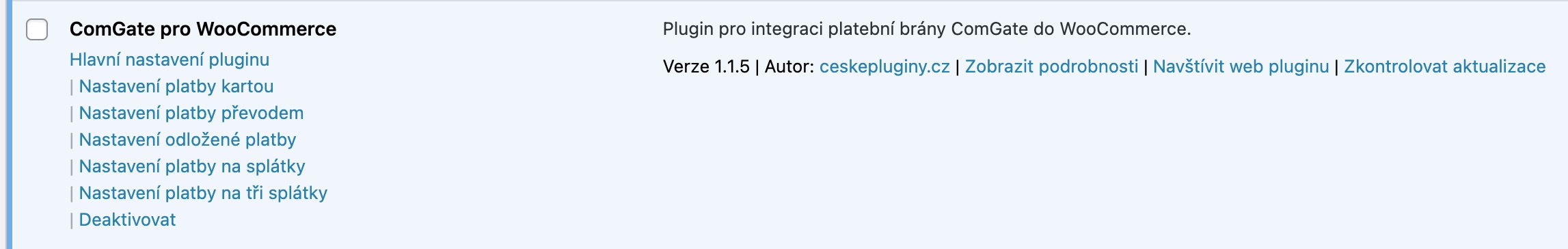 Na stránku, kde máte v administraci seznam všech pluginů jsme pro vaši lepší orientaci přidali odkazy na stránky hlavního nastavení pluginu Comgate pro WooCommerce a taky na stránky nastavení jednotlivých platebních metod.