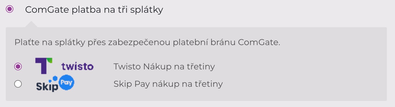 Konečně jsme přidali platbu na tři splátky. Najdete ji opět jako samostatnou platební metodu, pro kterou můžete vybrat její podmetody. Momentálně jsou poskytovateli této metody Twisto a Skippay.
